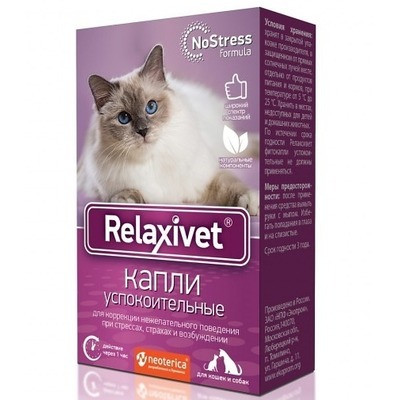 Релаксивет капли успокоительные предназначены для коррекции нежелательного поведения при стрессах, страхах и возбуждении у кошек и собак.